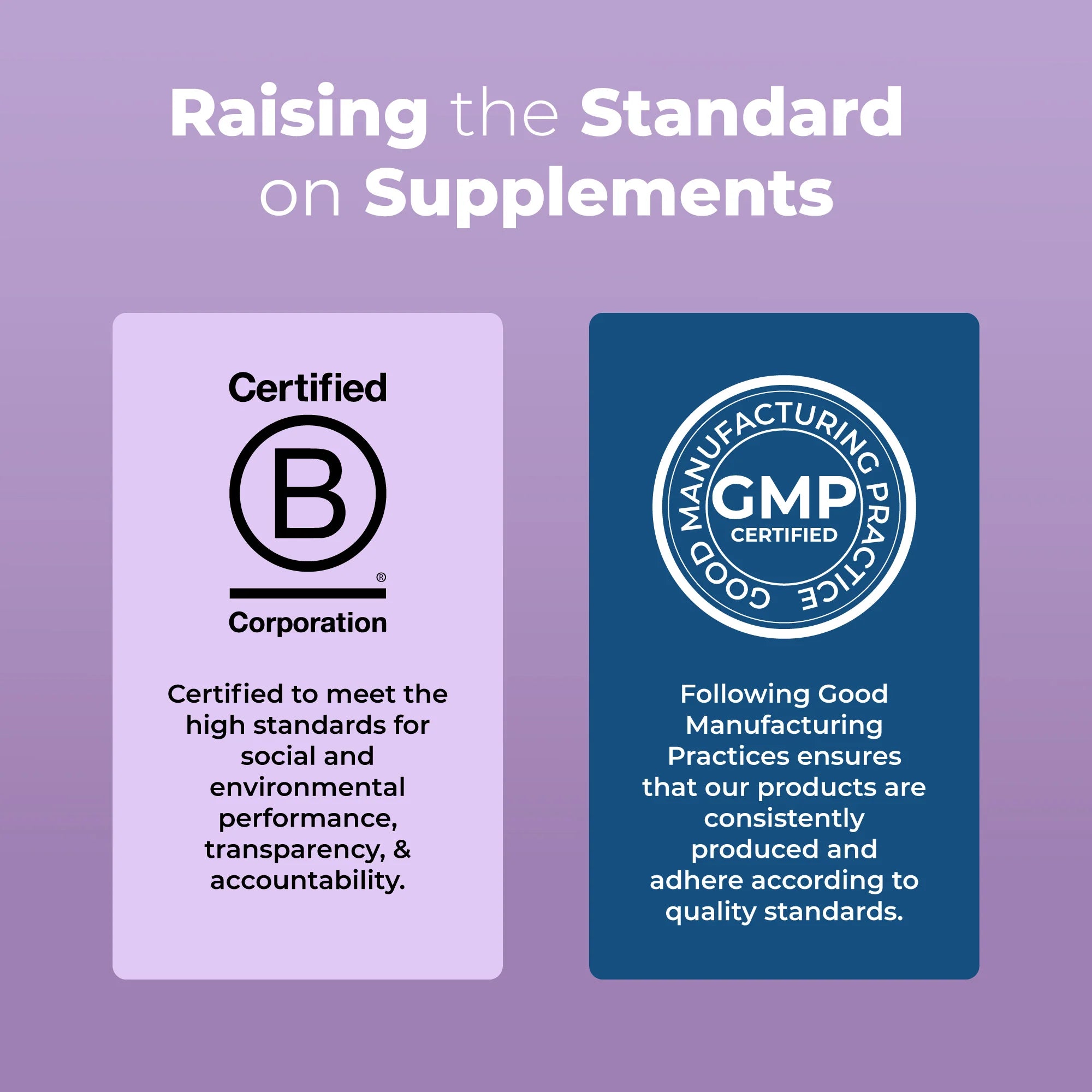Certified B Corp,Women-Owned,Non-GMO,Vegan,Dairy Free,Gluten Free,Nut Free,Soy Free,GMP Facility Made