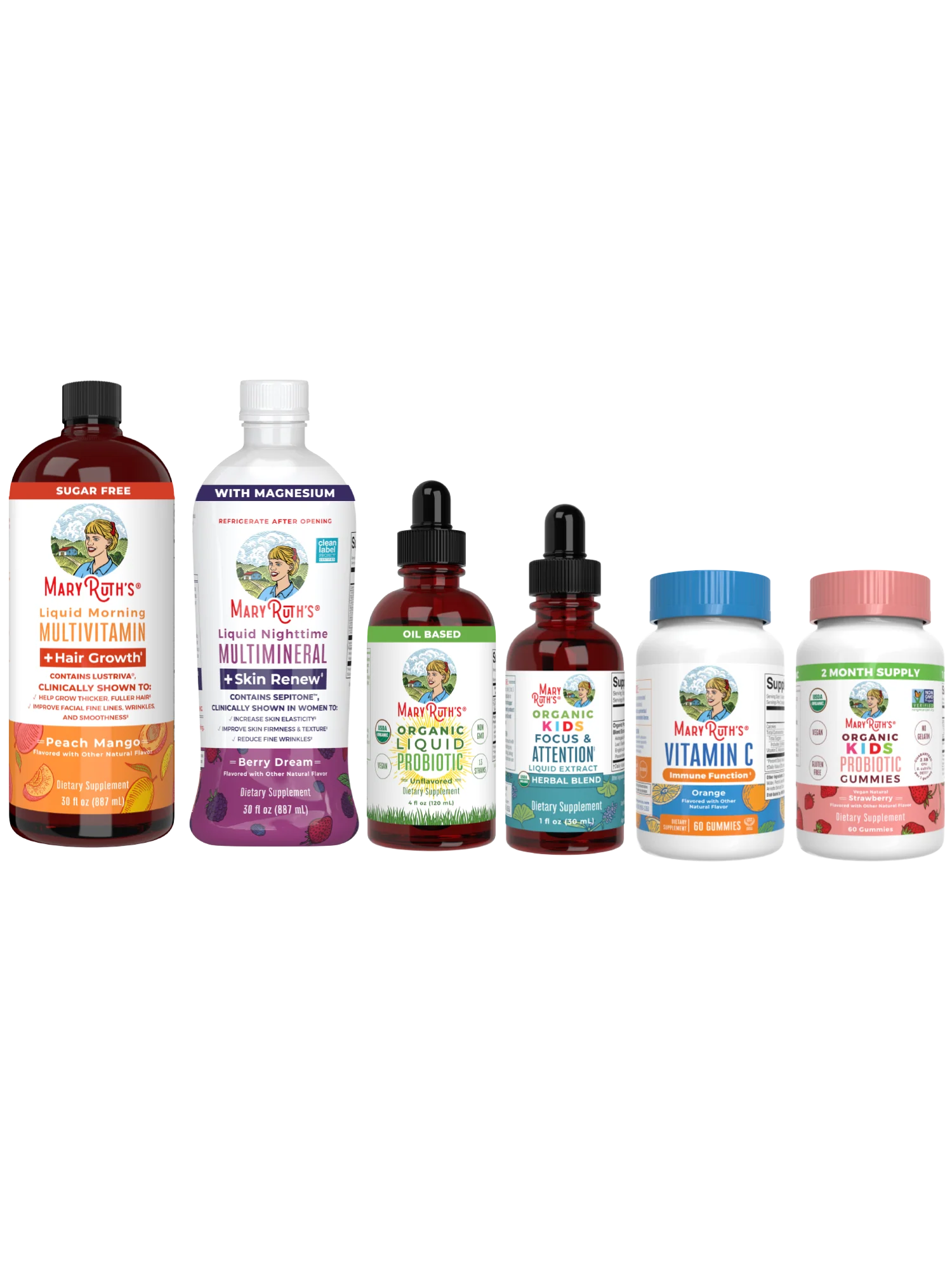 Give your whole family a simple, delicious way to stay nourished each day with this thoughtfully curated wellness bundle. Start the morning off with our Liquid Morning Multivitamin + Hair Growth, providing essential nutrients to support daily vitality from within. Add everyday gut support with our oil-based Organic Liquid Probiotic, formulated with 13 unique probiotic strains to support gut health. As the day winds down, our smooth and sweet Liquid Nighttime Multimineral + Skin Renew offers an essential blend of minerals plus skin-supporting Sepitone. Plus, keep little ones supported with our Vitamin C Gummies, Kids Multivitamin Gummies, Organic Kids Probiotic Gummies, and Organic Kids Focus & Attention Liquid Drops, all formulated to make daily wellness easy and enjoyable for every life stage! Together, this bundle brings enjoyable, consistent support to the whole family’s routine — morning, evening, and everything in between.