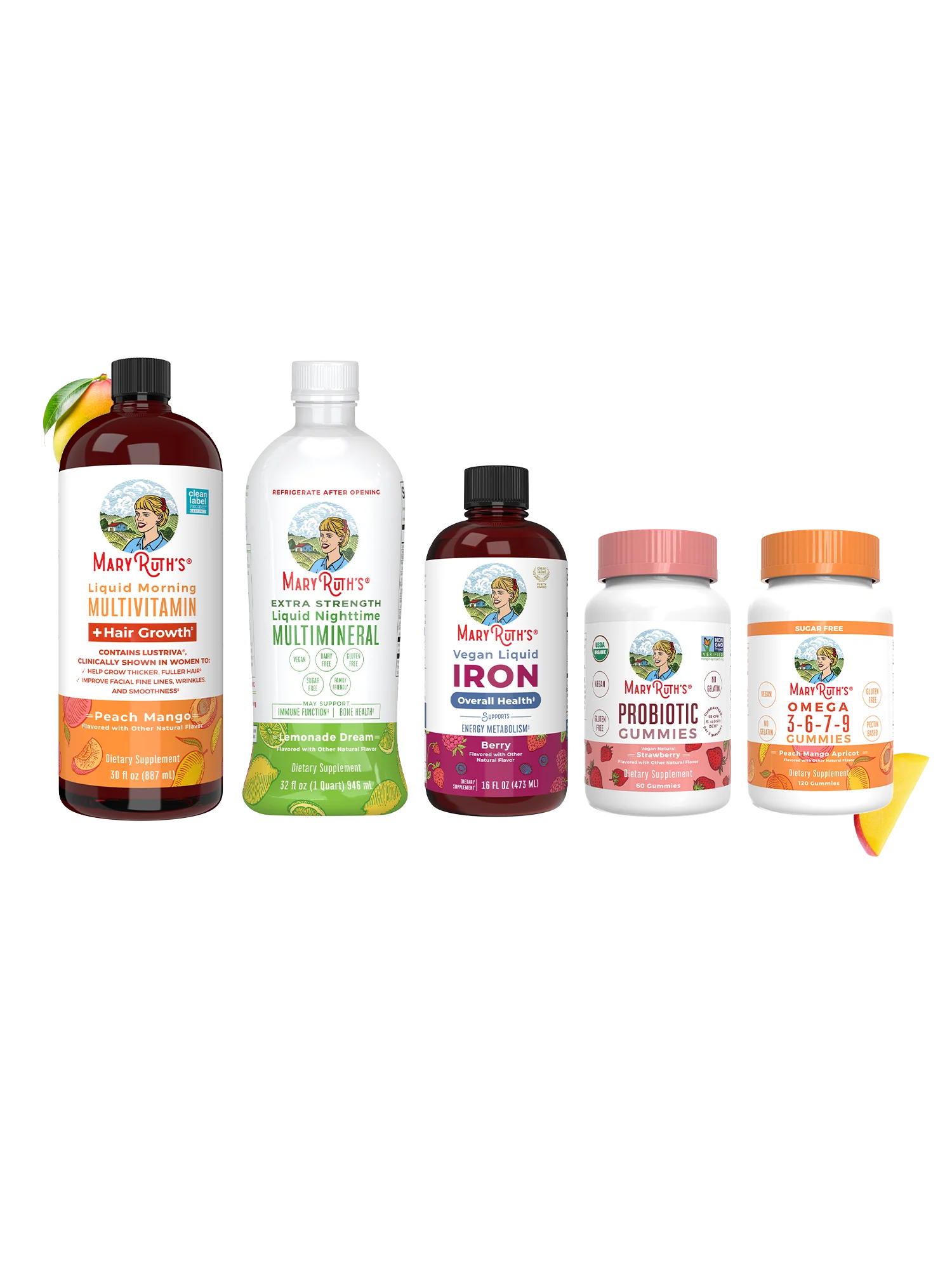 Looking for the main types of supplements MaryRuth recommends when starting your health journey — with the bonus of hair growth by increasing hair thickness in women? Start here! Let the collaborative power of our Liquid Morning Multivitamin + Hair Growth, Liquid Iron, Organic Probiotic Gummies, Omega 3-6-7-9 Gummies, and Extra Strength Liquid Nighttime Multimineral support your body throughout the day & into the night with delicious and easy-to-take formulas.