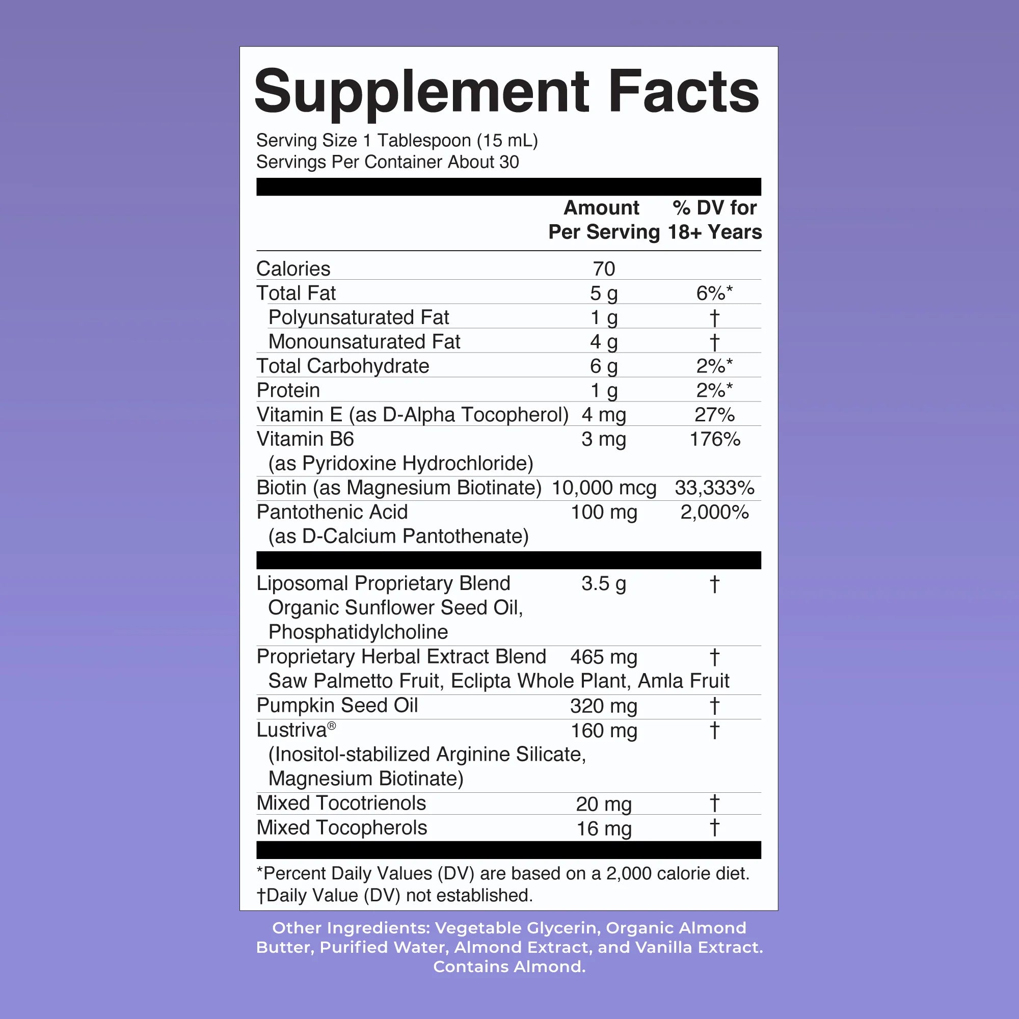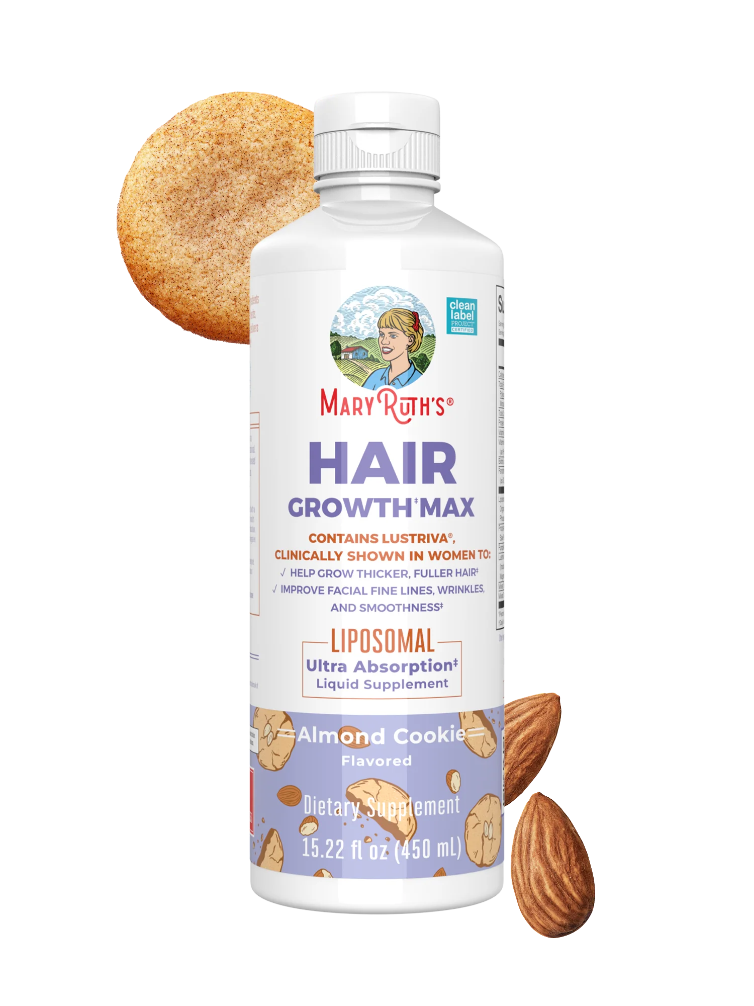 Give your hair and skin extra support with the Hair Growth Max Liposomal! This delicious, ultra absorption formula combines a blend of herbs and oils as well as Lustriva®, clinically shown to help grow thicker, fuller hair in women, while also improving facial lines, wrinkles, and skin smoothness.