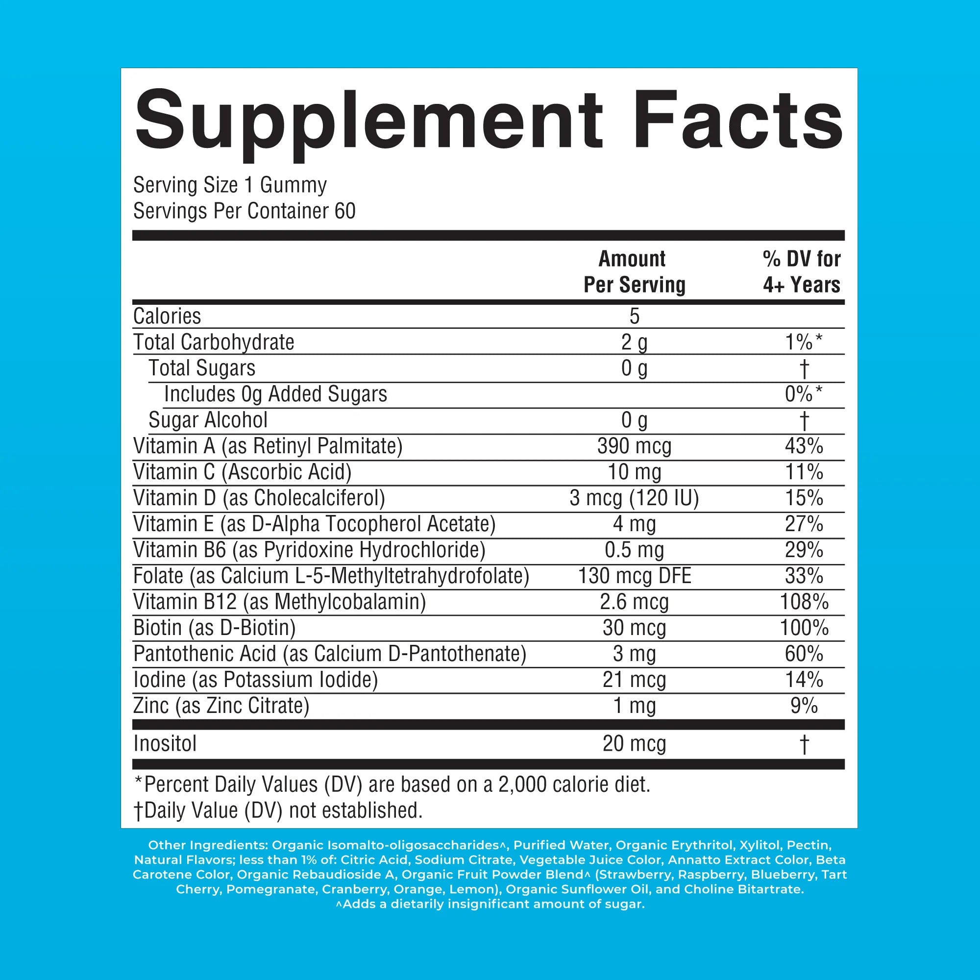 Suggested Use: Ages 4+ can take 1 gummy per day or as recommended by a physician or healthcare professional. If not chewed properly, this product is a potential choking hazard. Do not exceed the recommended dose.