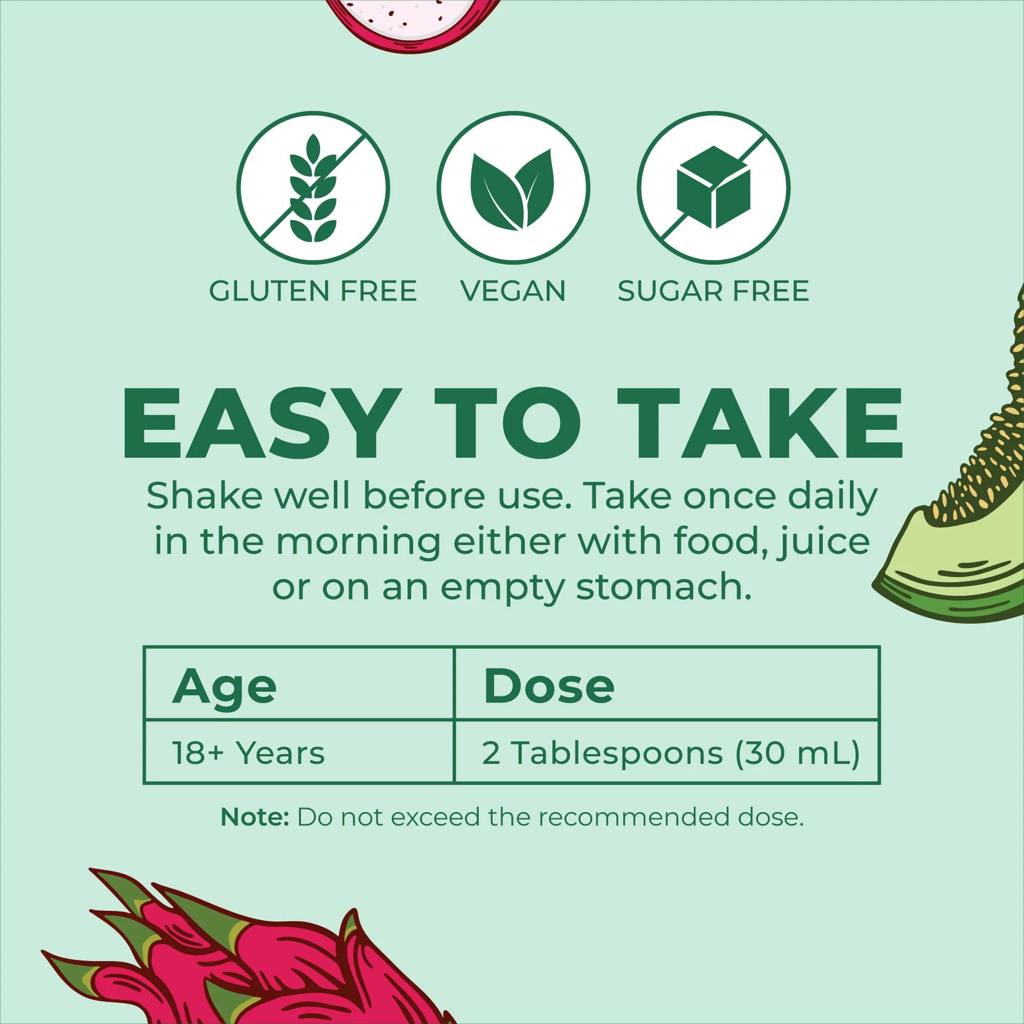 Suggested Use: Shake well before use. Adults 18+ take up to 2 tbsp (30 mL) daily or as recommended by a physician or healthcare professional. Take in the morning either with food, juice or on an empty stomach. Do not exceed the recommended dose.
