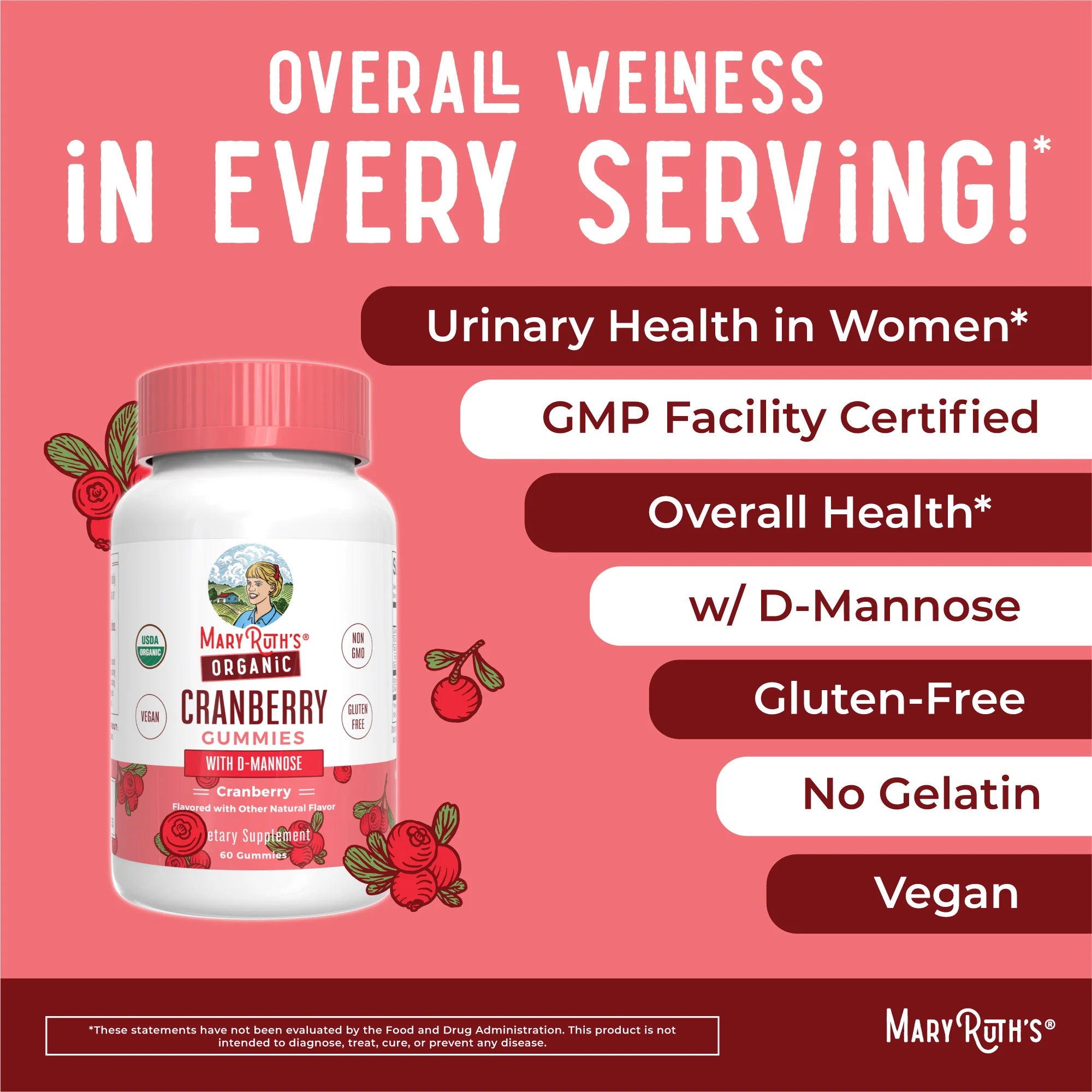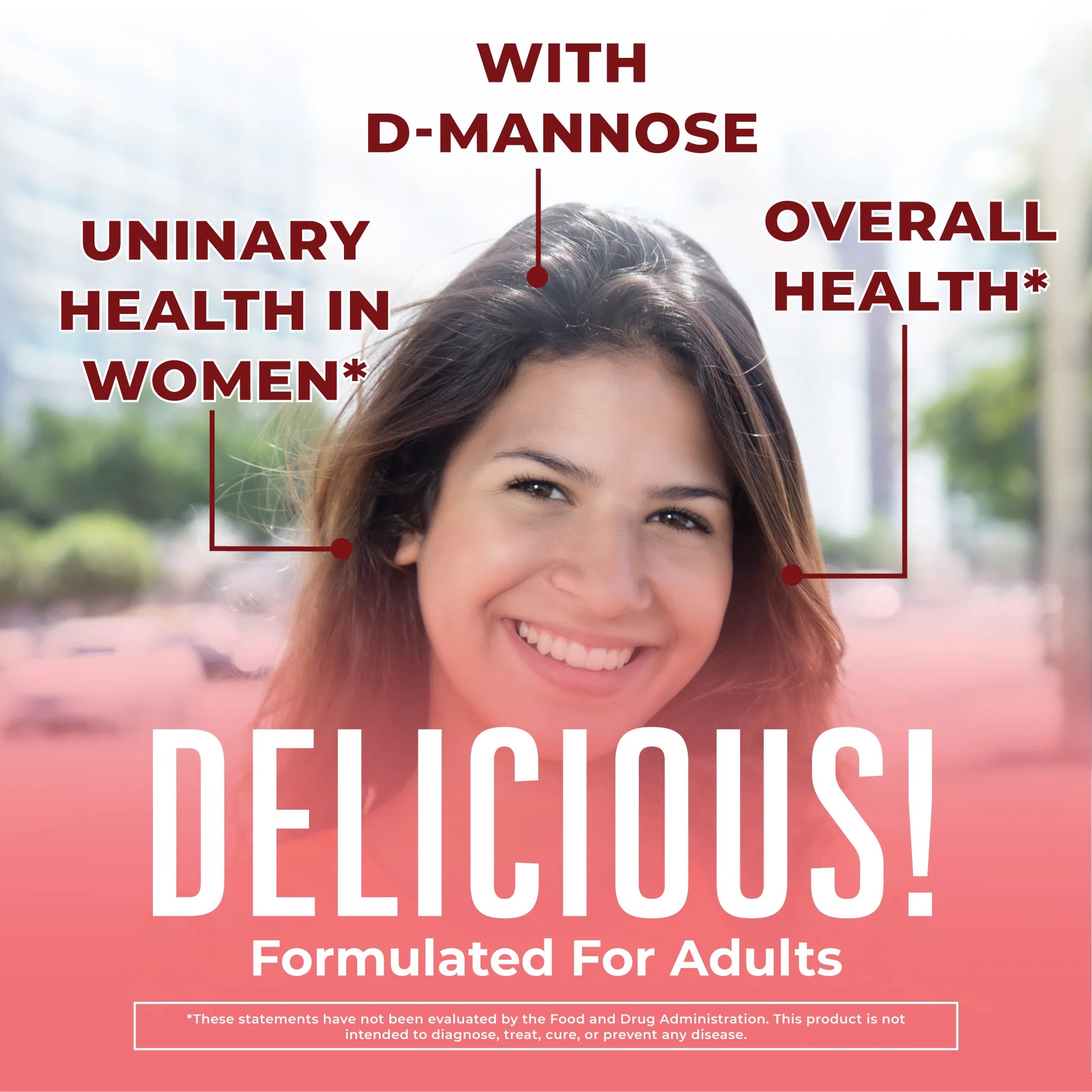 These cranberry-flavored vegan gummies are a tasty way for women to maintain urinary health! Each 2-gummy serving contains 500 mg cranberry fruit extract plus 25 mg D-Mannose.