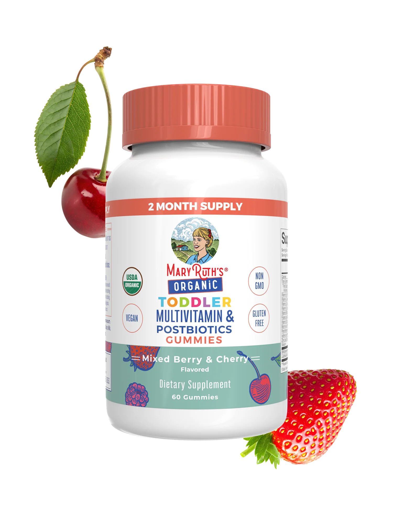 Support your toddler’s health with all of these nutrients, plus Bifidobacterium lactis and Lactobacillus rhamnosus as postbiotics in mixed berry and cherry flavored chewable gummies!