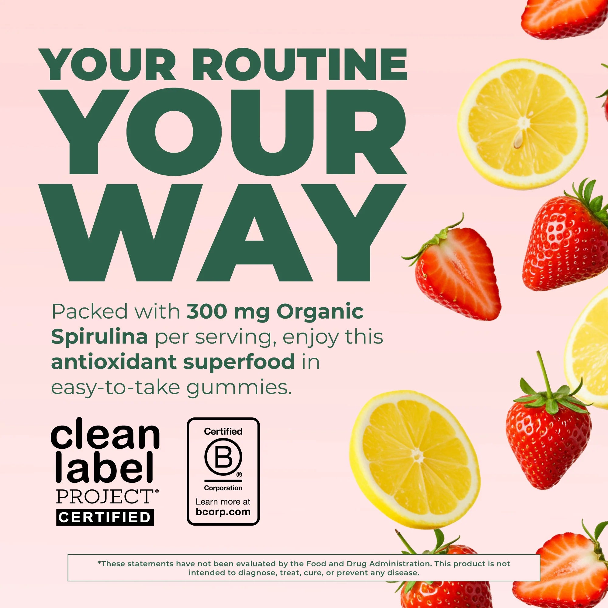 Your Routine, Your Way: Enjoy taking spirulina in chewable form with these strawberry lemonade-flavored vegan gummies!